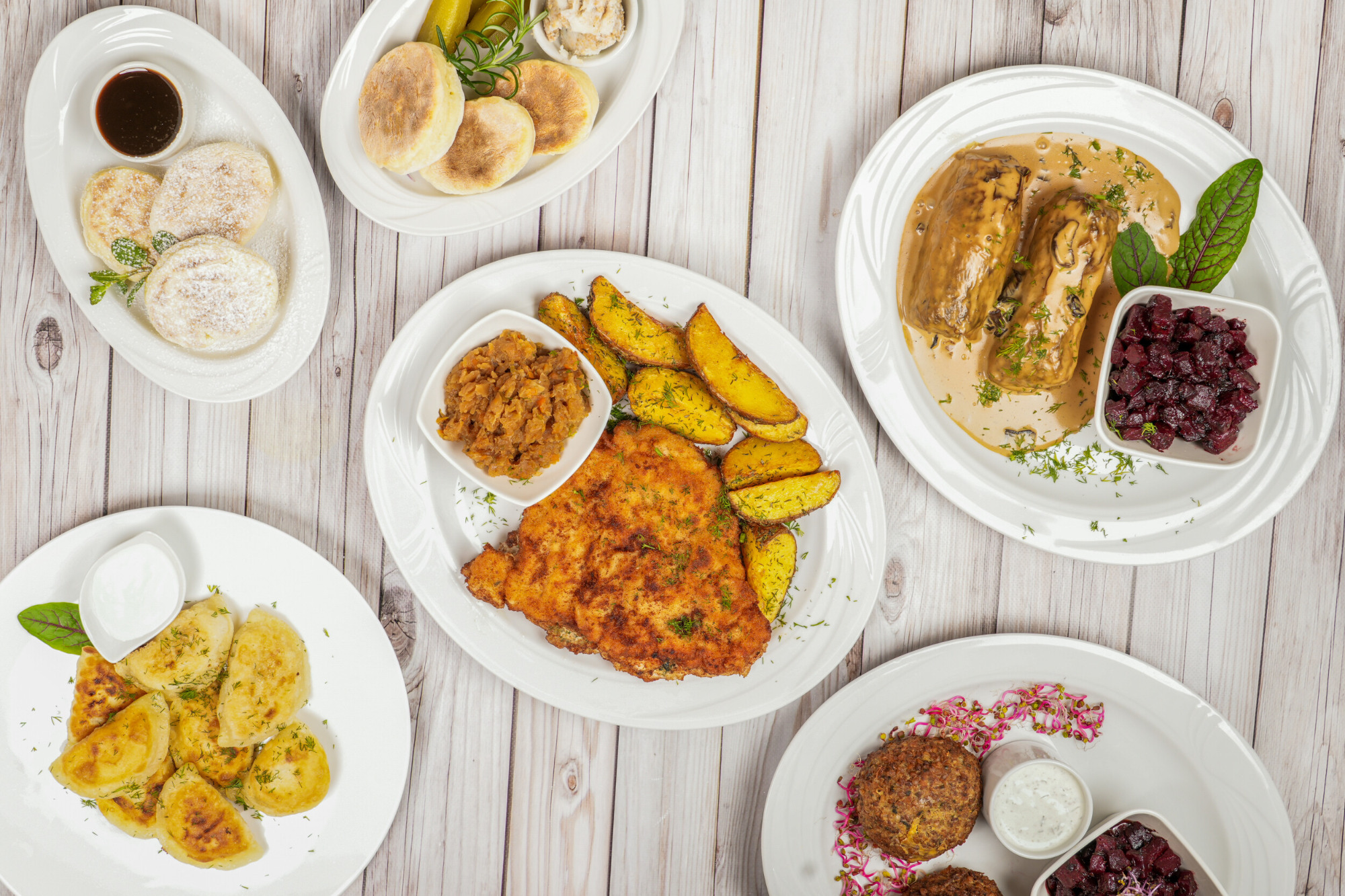 Mięso mielone z kaszą gryczaną smażone w formie kotletów, podawane z karmelizowanymi buraczkami i sosem śmietanowym z czosnkiem i koperkiem. -